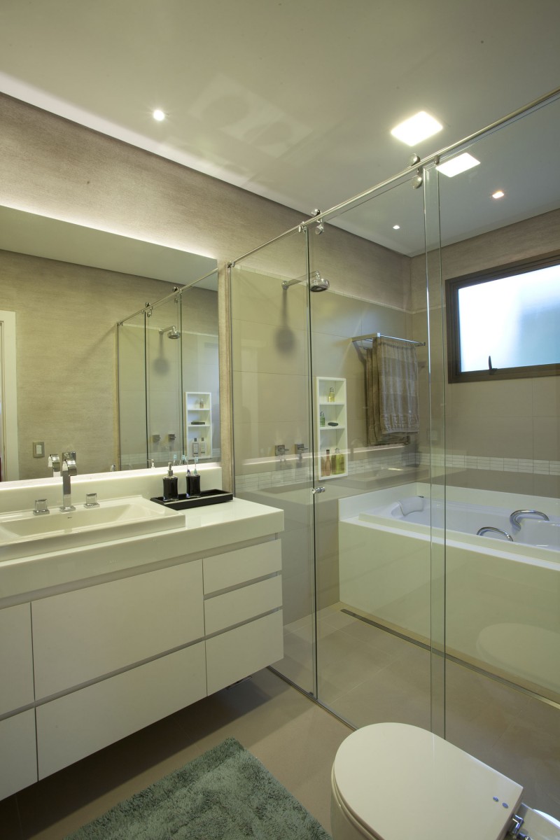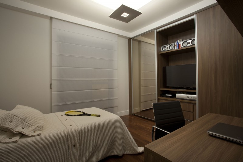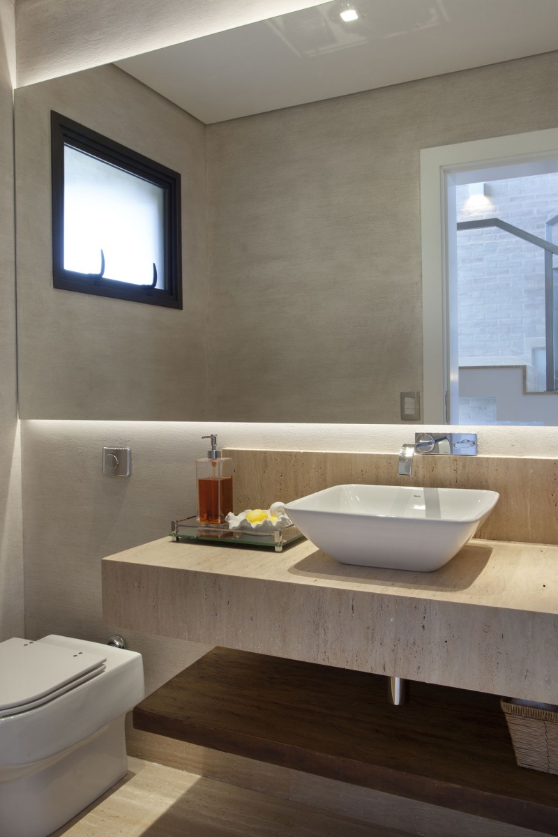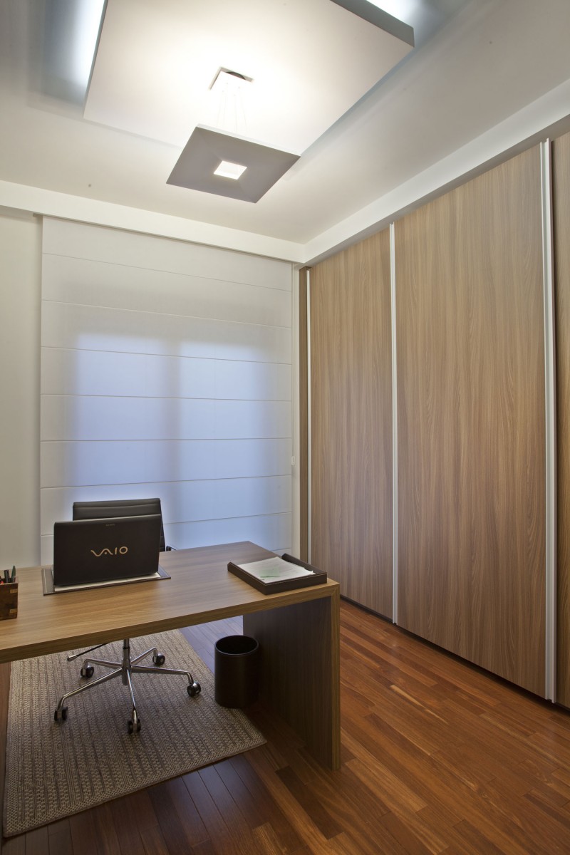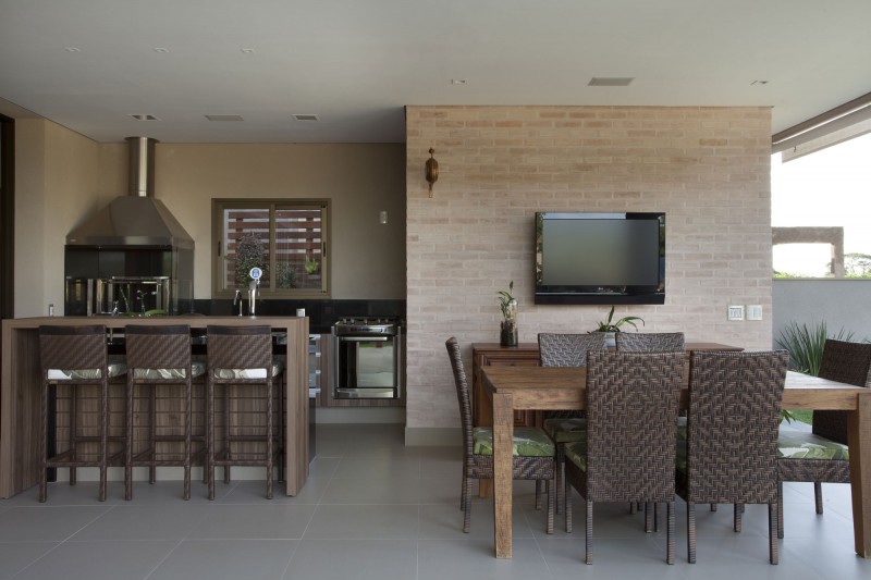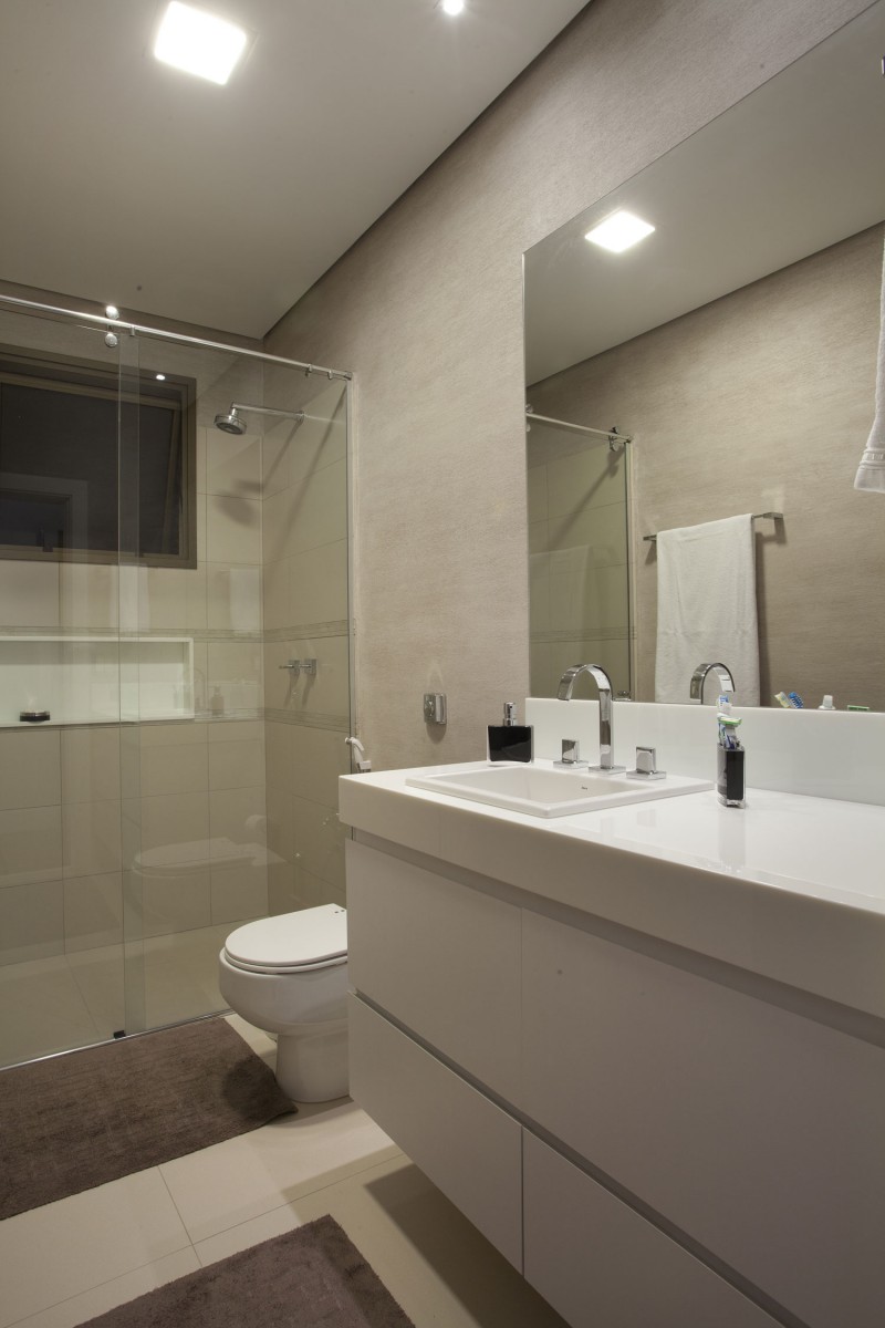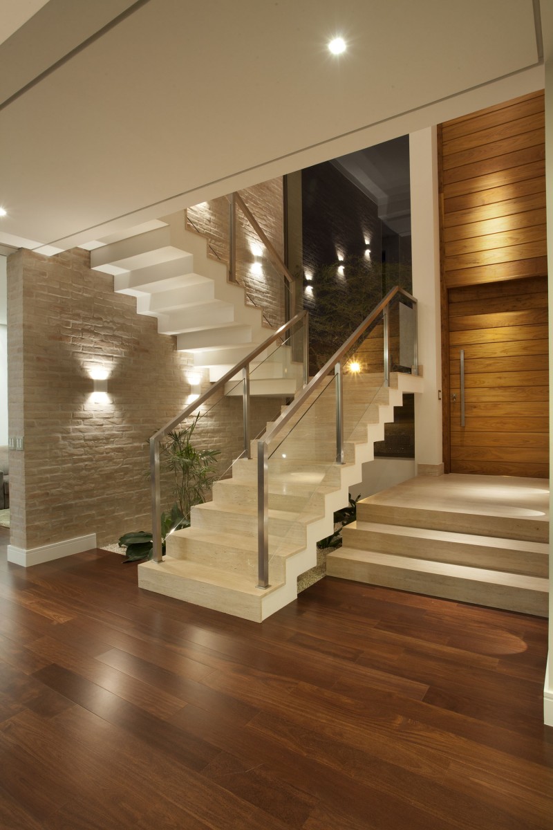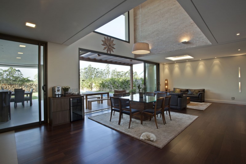 Il primo livello ospita una sala dalle dimensioni generose e la sala da pranzo, una zona di ritrovo per tutta la famiglia. Zone funzionali sono sottilmente divisi: la zona salotto, tavolo da pranzo, cucina, bar, veranda. Legno è stato impiegato in tutto, diminuendo l’imponente effetto degli alti soffitti e trasformandolo in un ambiente più accogliente. Una scala in marmo bianco collega il piano terra con le camere da letto di cui sopra. Una delle caratteristiche principali di progettazione di Residence DF in Brasile è la presenza di grandi finestre, che contribuisce ad una connettività ottimale con l’aria aperta.