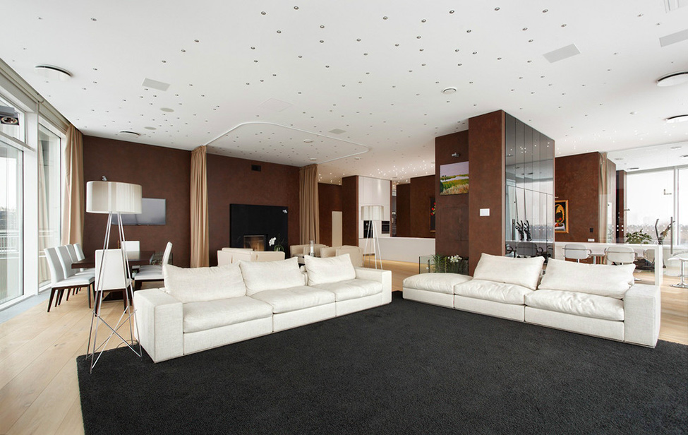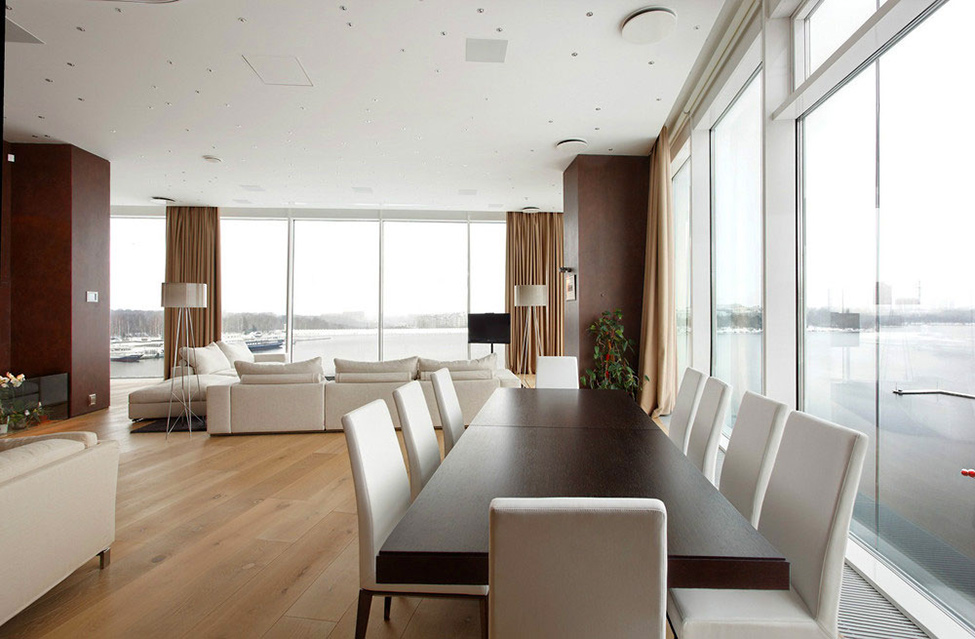 Una particolarità di questo appartamento russo è che le pareti esterne sono praticamente scomparsi, sostituiti da vetri continuo. Spazio libero è consentito anche a cancellare i confini tra stanze separate, dirigendo l’attenzione sul paesaggio circostante.