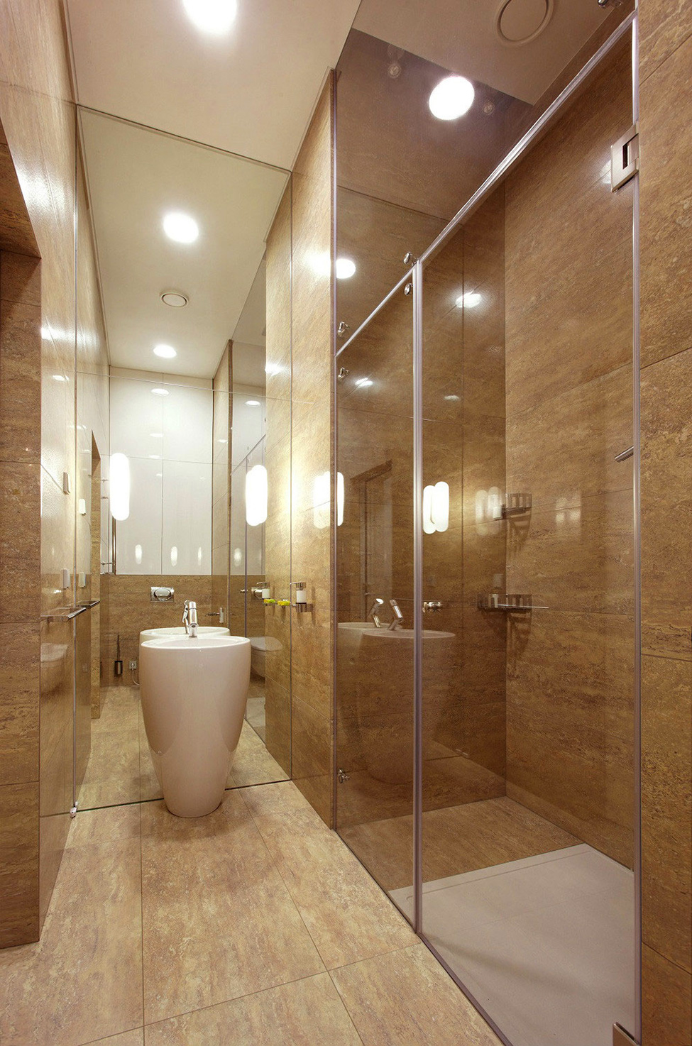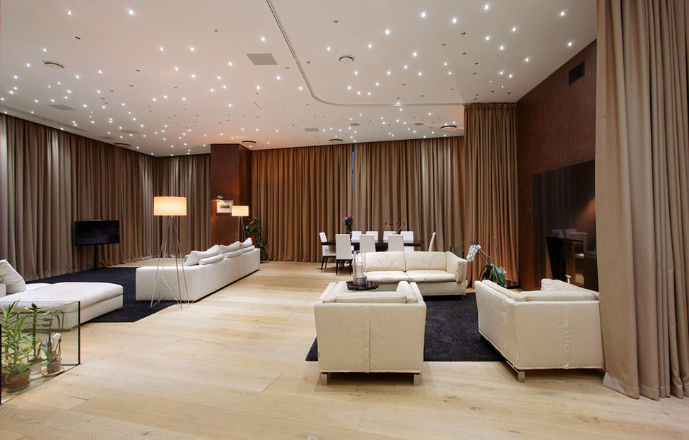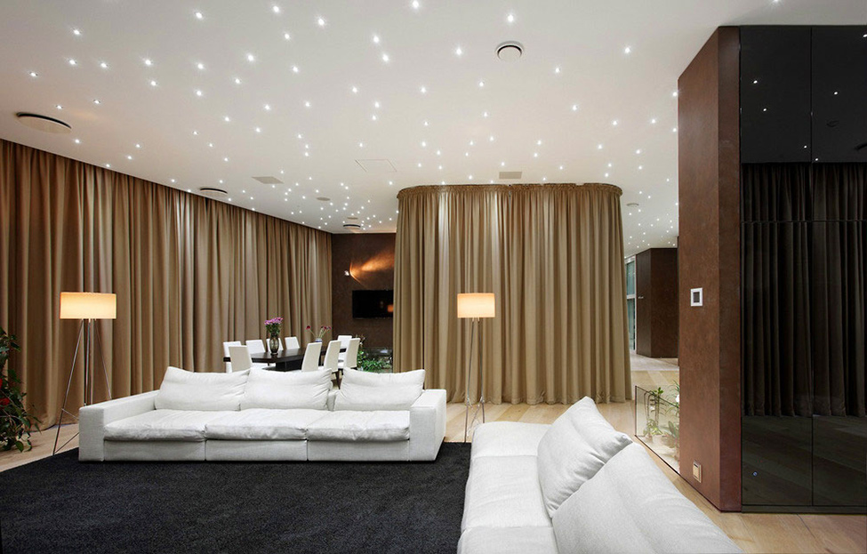 Il soggiorno è il cuore dell’appartamento; immaginato in maniera minimalista, questo interno è riservato per contemplare i dintorni, mentre seduto comodo nel divano o a una cena rilassante.Tende dal pavimento a soffitto con scopi pratici, migliorando anche la sensazione di un presepe reale. E siamo certi che ormai hai scoperto la matrice di corpi illuminanti sui soffitti. Quando illuminato, questi numerosi punti creano un ambiente giocoso, “scintillante”.