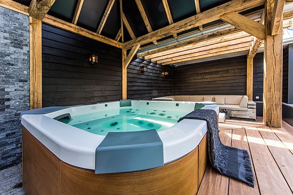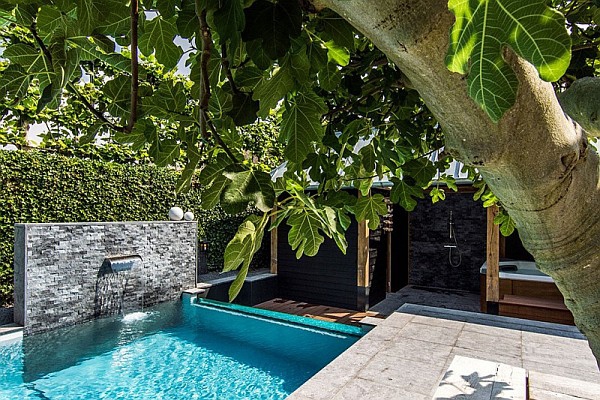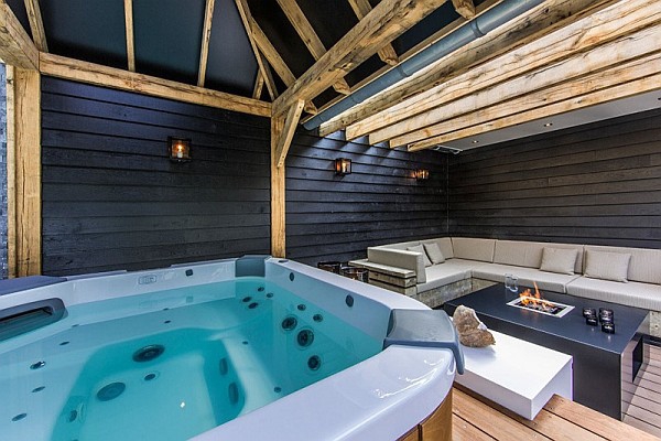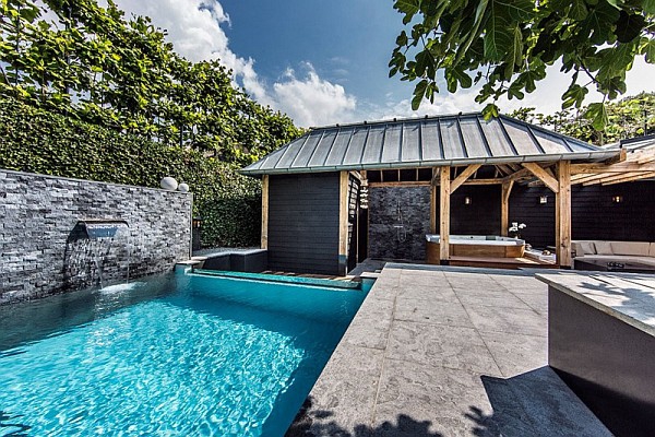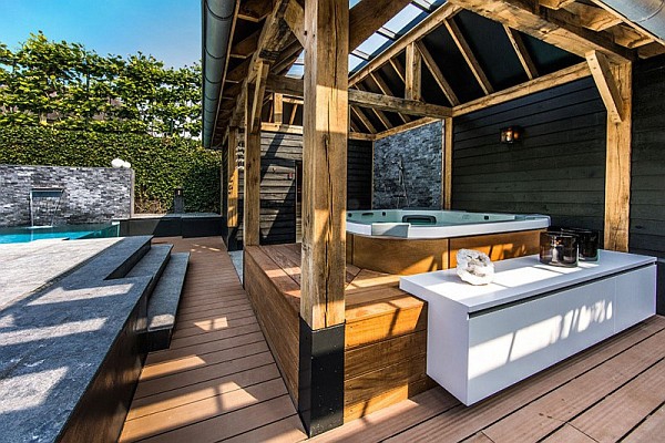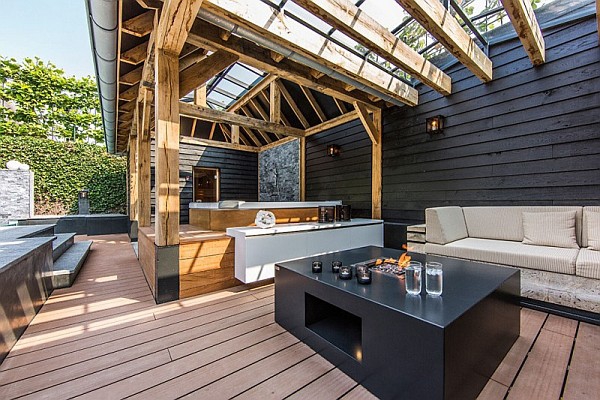 L’idea dell’orto o frutteto non entrò nella visione dei designer, ma piuttosto l’idea di creare uno spazio per il relax all’esterno, per i proprietari del residence. Inoltre, i progettisti non hanno portato mancanza di metri quadri e sono stati in grado di mettere in pratica tutte le “fantasie” in termini di layout e design.Così, il vostro giardino o, meglio dire, la corte dietro e casa è una terrazza, una piscina spaziosa e una sauna e una jacuzzi. Un arrangiamento opulento non implica necessariamente una progettazione occupata, “ricca” di elementi, ma piuttosto una distinta qualità di materiali impiegati o un concetto innovativo.