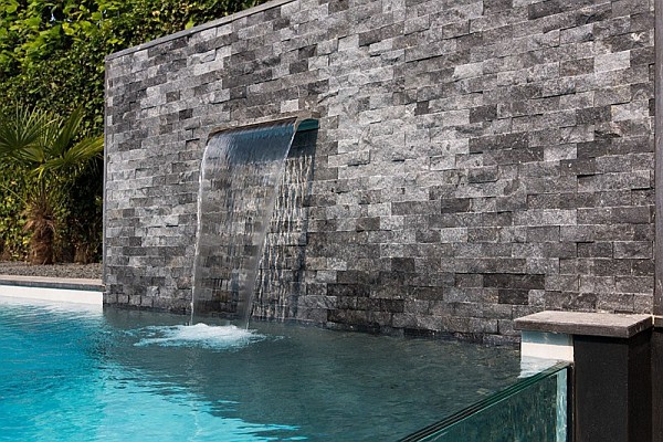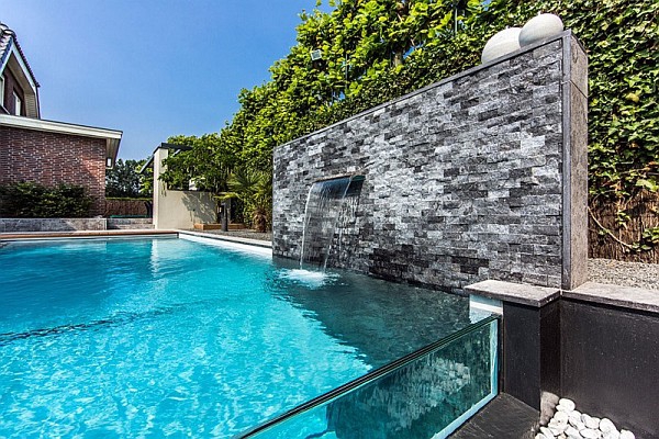 In questo caso, i materiali naturali sono quelli che aggiungono valore ai giardini. Legno e pietra naturale sono le principali finiture utilizzate. Il suo design moderno è confermato dalle linee “pulite” di mobili e organizzazione impeccabile degli elementi. Ad esempio, limitando albero di peonia è un modo elegante per eliminare ancora più evidente.Un dettaglio interessante è la piscina. Una delle sue estremità è interamente in vetro, lasciando l’impressione che l’acqua della piscina galleggia.