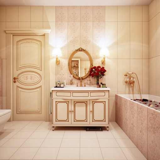 I colori ad alto contrasto, i rubinetti retrò con finitura d’oro o argento con lampade viventi intelligente progettato per distribuire la luce, danno un bagno romantico.