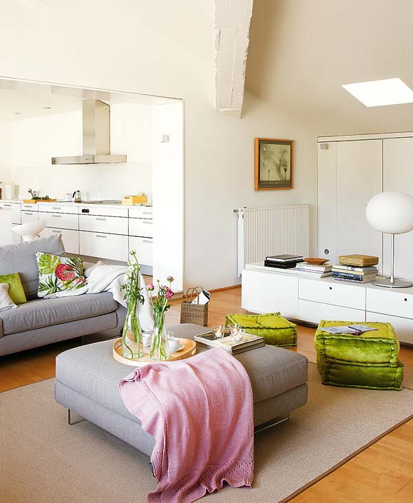 E ‘incredibile come l’aggiunta di un po’ di colore può completamente trasformare tutto il modo in cui una casa si sente. Questo è stato probabilmente quello che i progettisti avevano in mente quando si riempie questo luogo con colorati elementi di decorazione, come soffici cuscini sul pavimento, piccoli tappeti e contenitori rustici molto piccoli. A causa del fondo bianco, questi articoli si distinguono e creano un piacevole contrasto visivo. Il soggiorno, sala da pranzo e la cucina sono collegati non solo fisicamente, ma anche design-saggio. Ci piace come questa casa sembra essere decorata rispettando un modello divertente, che coinvolge il colore e la giovinezza.