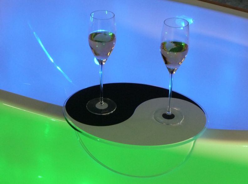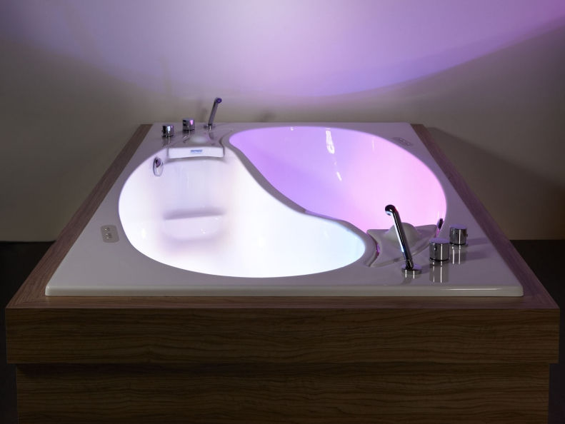 E ‘un tipo di terapia di coppia, incoraggiando a fare quante più cose possibili insieme, promuovendo l’idea di “essere insieme, ma badando la propria attività”. “Ogni bagnante ha il suo / la sua acqua di balneazione. Temperatura, additivi balneari e il colore della luce possono essere scelti individualmente. Anche in termini di igiene, la separazione delle acque di balneazione è una soluzione ottimale. Se i libri di una singola persona, un bagno, è necessaria solo la metà della quantità di acqua. “ La forma ricorda il simbolo cinese Yin e Yang, che esprime il continuo cambiamento degli opposti. In cima a quello, si arriva a sentire le vibrazioni musicali in ogni fibra del tuo corpo e gustare l’ottima combinazione di colori arcobaleno nel vostro bagno.