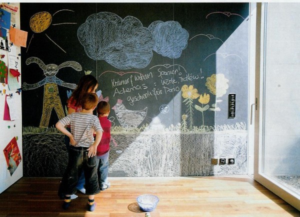 Vernice lavagna.Un altro modo per decorare la parete per bambini, mentre stimolando l’apprendimento dei bambini è quello di trasformare la parete in una vera e propria scheda. In esso, si possono scarabocchiare, disegnare e imparare le loro prime lettere possono anche mettere un grande blocco di schizzi accompagnati da un’ampia varietà di colori e pastelli.