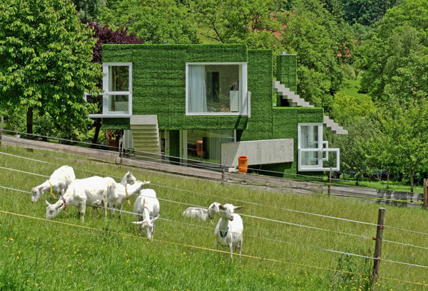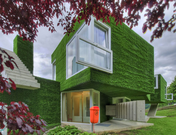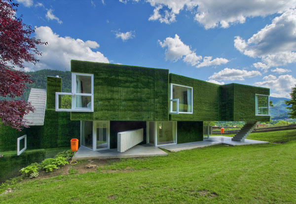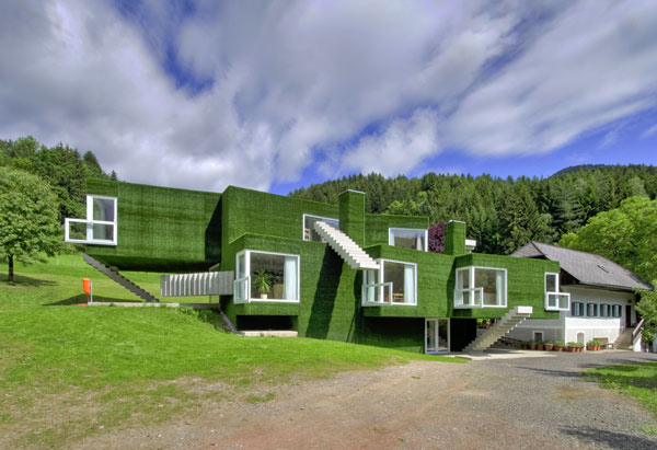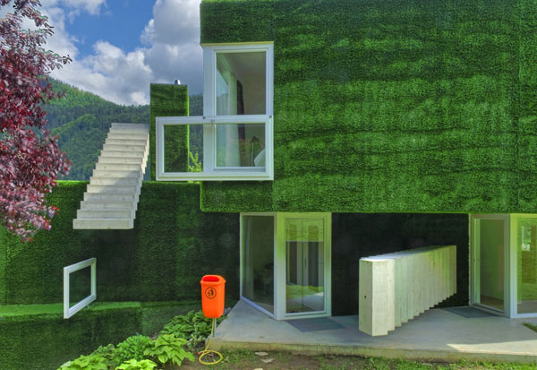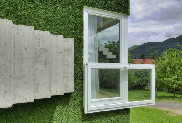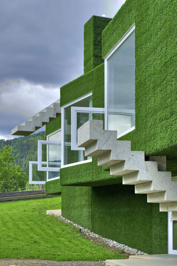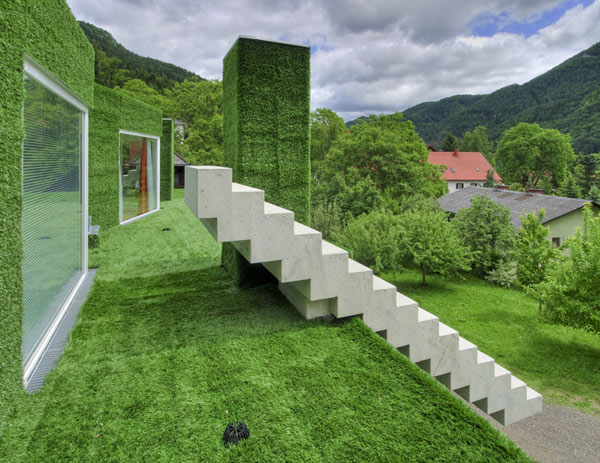 Questa insolita casa indipendente, mostra una facciata volumetrica coperta da una morbida erba sintetica che ricopre volumi con dettagli inusuali, trapassato da scale stranamente piazzati e grandi finestre ornate con altre finestre. Sì,c’e tanta da parlare di questa casa ma concentrandosi su ogni dettaglio alla volta ci dà una visione completa di questo verde residence a Frohnleiten, Austria. La casa unifamiliare può essere vista come un’esplorazione della connettività tra natura e architettura.