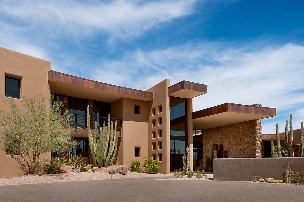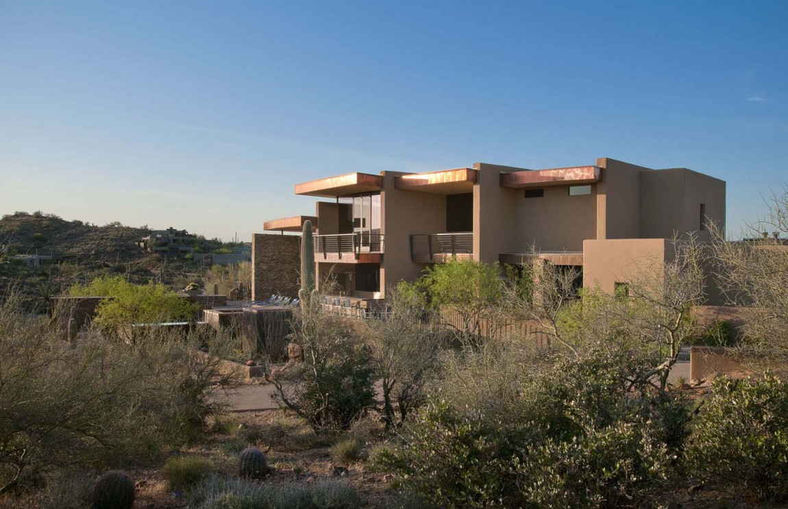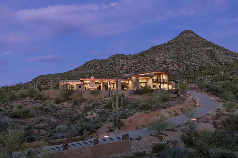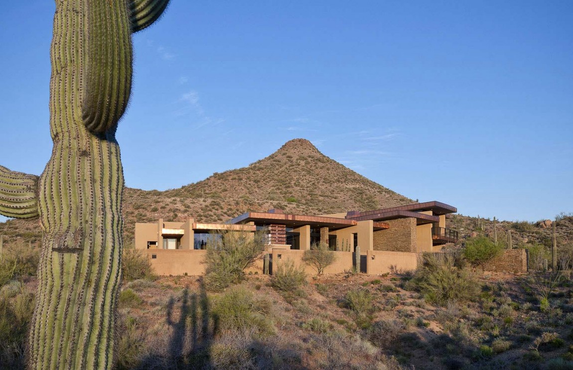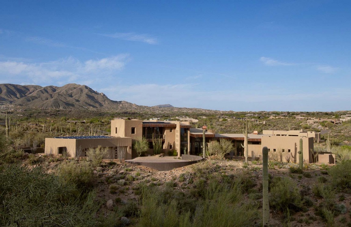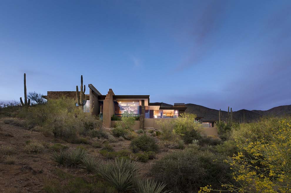 La casa dispone di 5 camere da letto e una splendida vista sul paesaggio che circonda, popolato da famiglie di cactus. È stato progettato by Tate Studio Architects e completata nel 2011. L’esterno è fatto di piastrelle in pietra naturale, che anche adornano l’interno della casa. In realtà, ci sono molti elementi naturali, decorando gli spazi abitativi interni:pannelli in legno , rivestimento in pietra, ciottoli e ultimo ma non meno importante, pannelli in vetro blu che ricordano il cielo vibrante dell’Arizona..