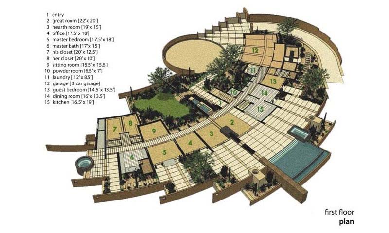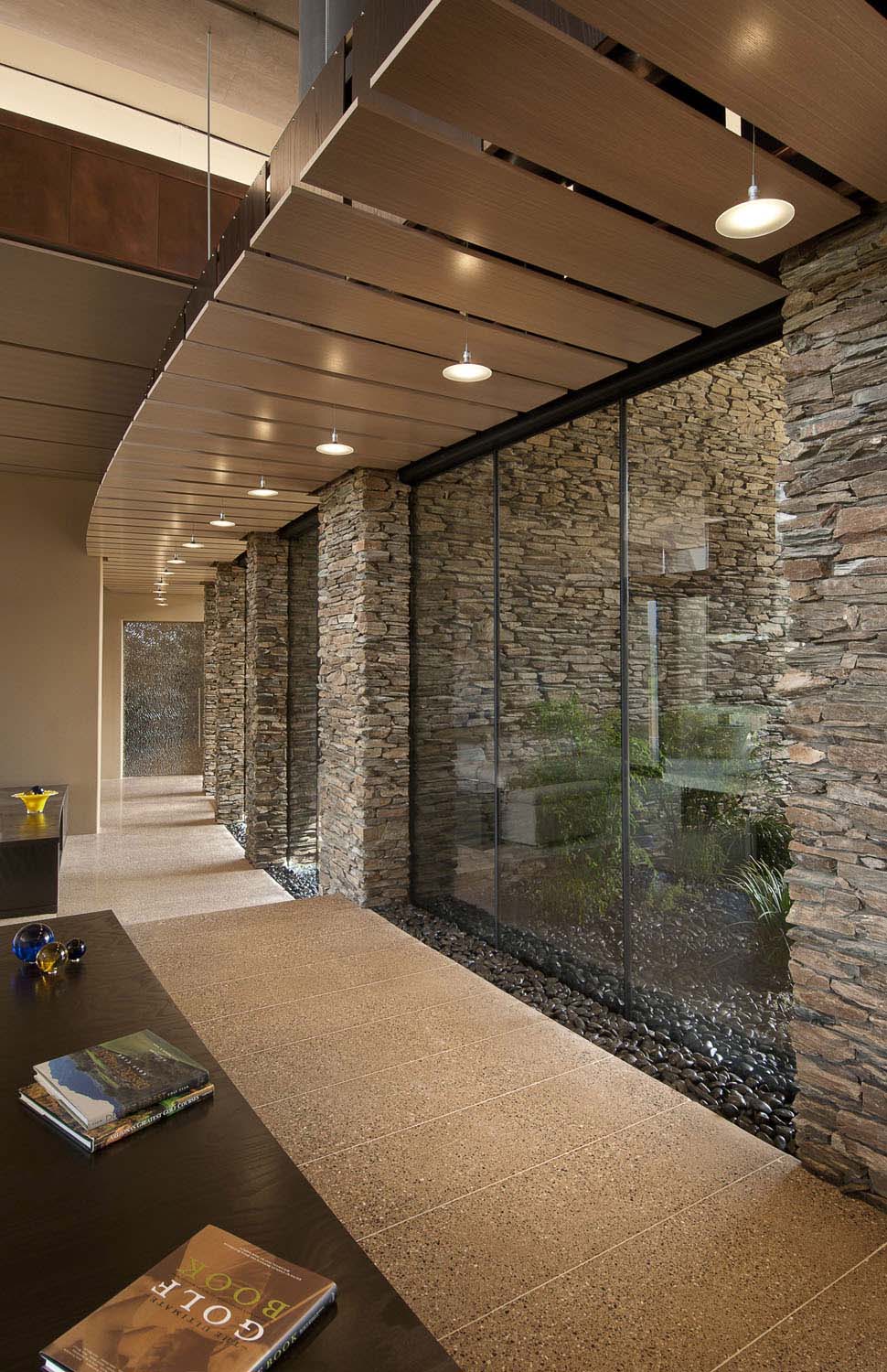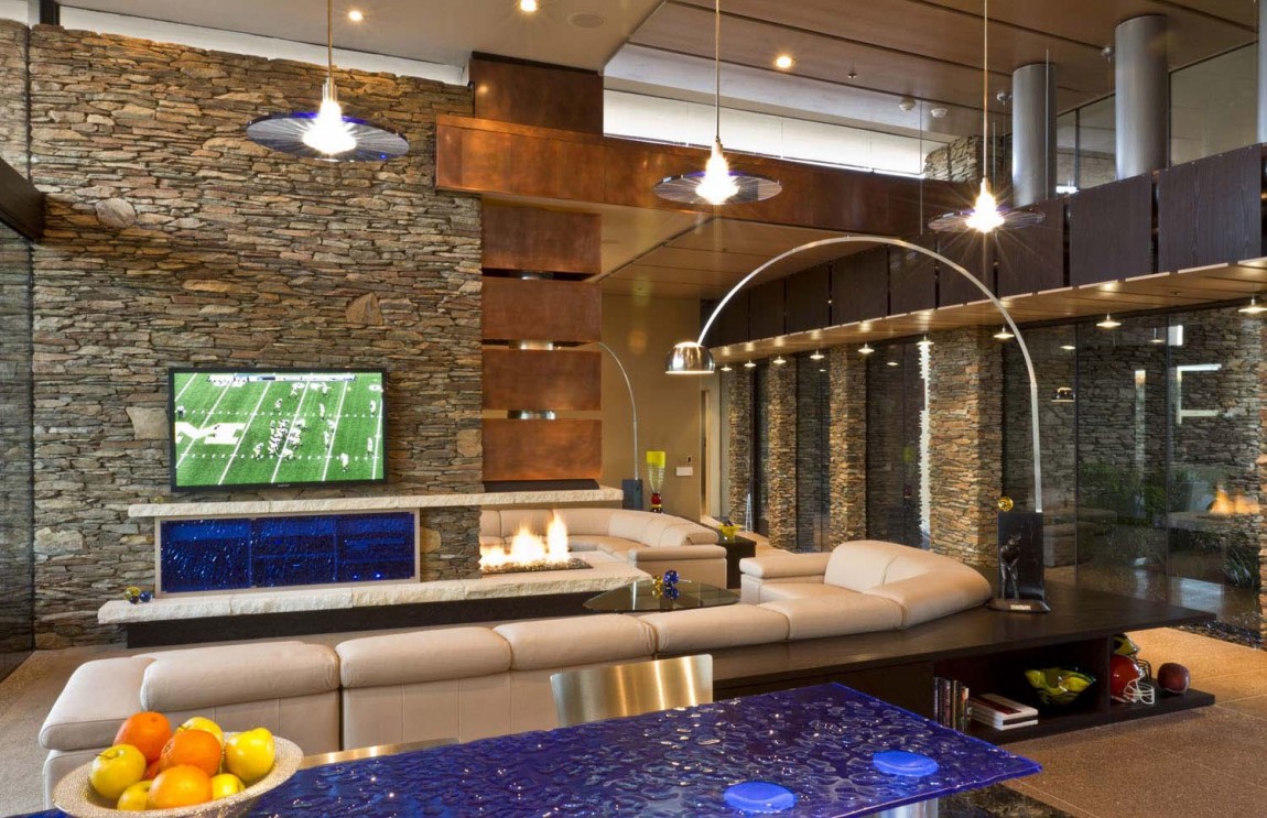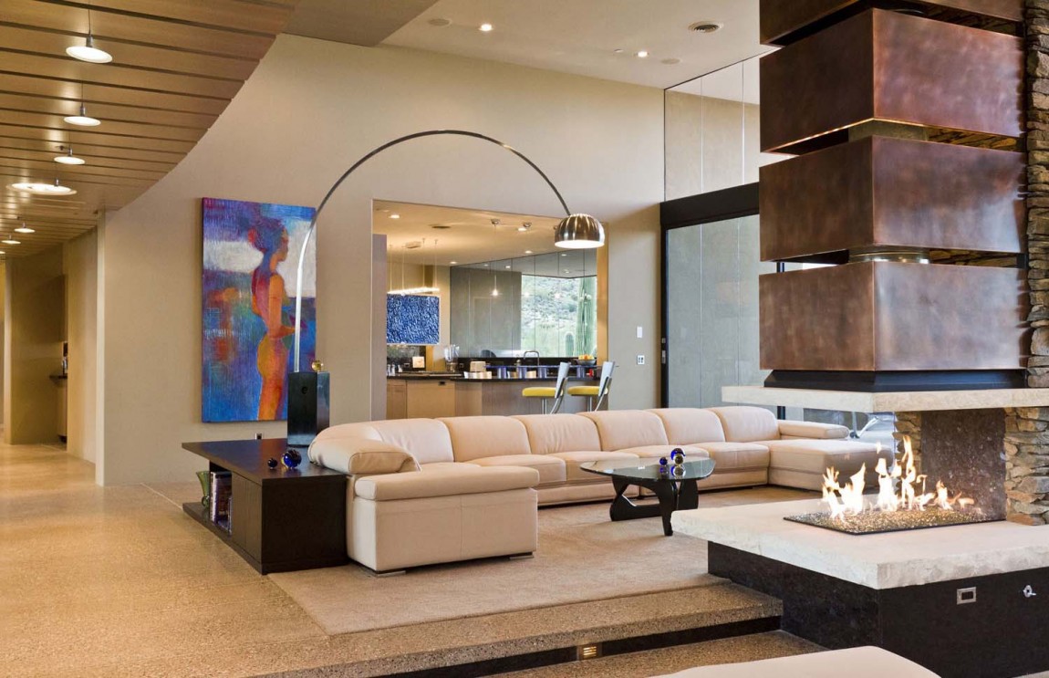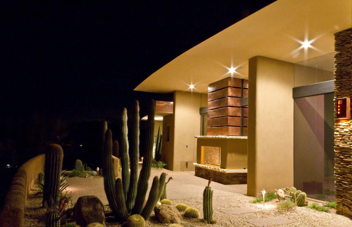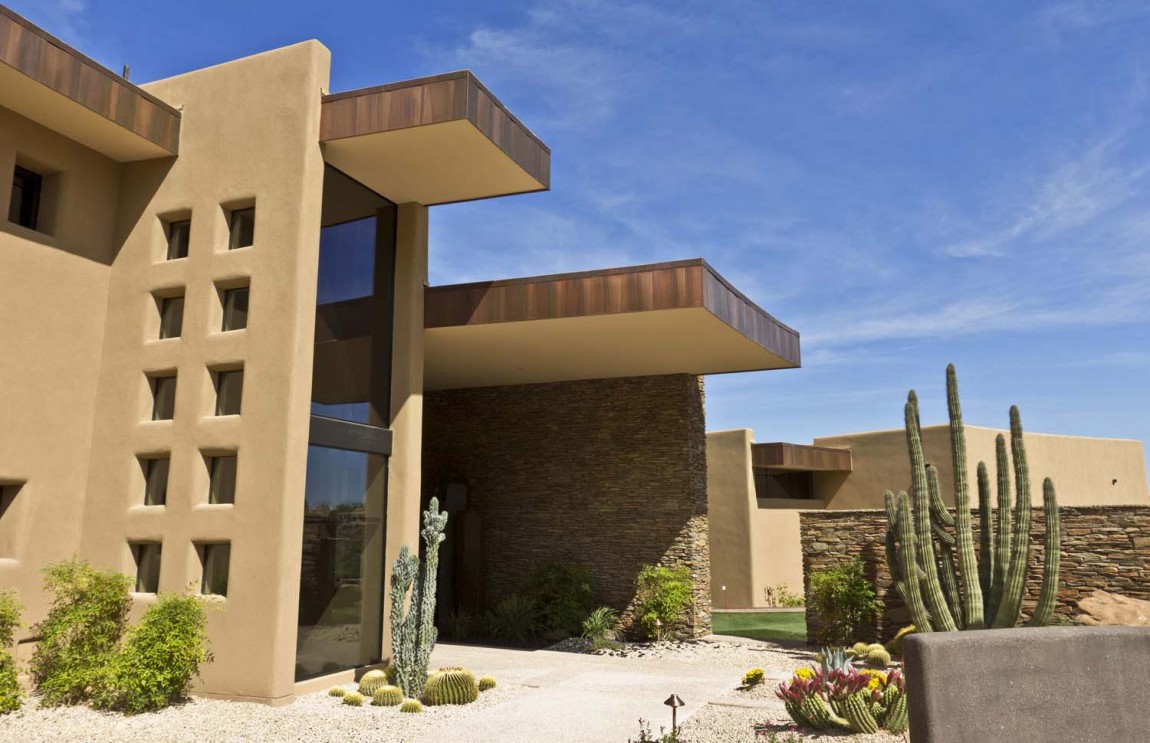 La casa dispone di 5 camere da letto e una splendida vista sul paesaggio che circonda, popolato da famiglie di cactus. È stato progettato by Tate Studio Architects e completata nel 2011. L’esterno è fatto di piastrelle in pietra naturale, che anche adornano l’interno della casa. In realtà, ci sono molti elementi naturali, decorando gli spazi abitativi interni:pannelli in legno , rivestimento in pietra, ciottoli e ultimo ma non meno importante, pannelli in vetro blu che ricordano il cielo vibrante dell’Arizona..