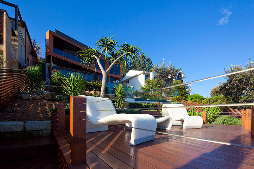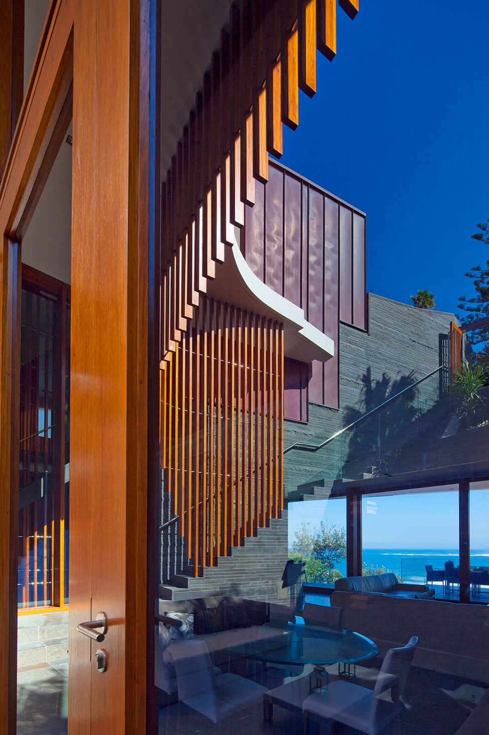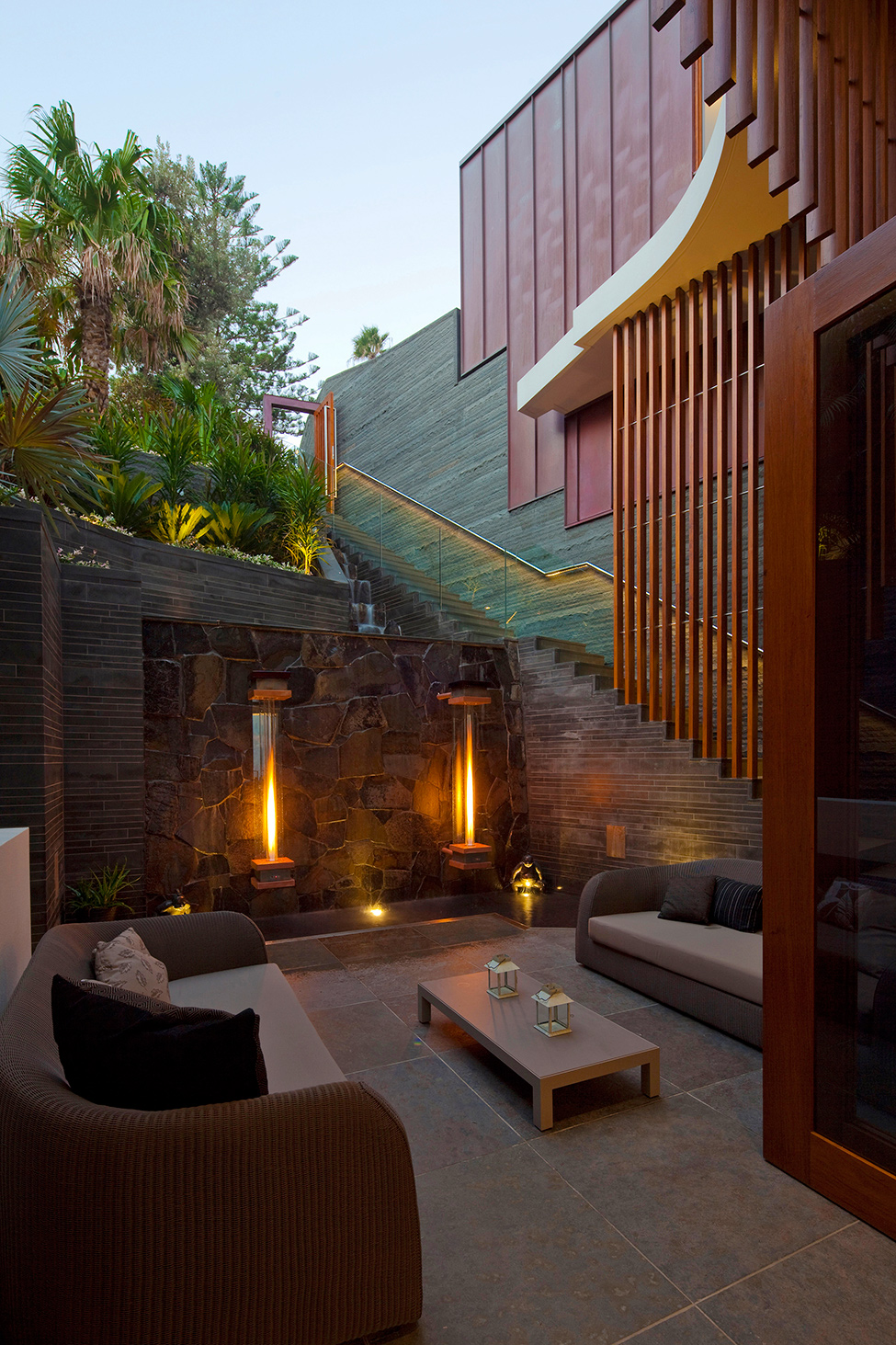 La casa è circondata da un pittoresco giardino, con cespugli e alberi esotici. Uno speciale sistema di illuminazione esterna crea una magica atmosfera durante la notte. ‘La casa passi giù il sito e si articola in tre elementi leggibili, prendendo spunto da un design tradizionale tripartito di formare una base, intermedia e superiore. Ritagliare, vetro, legno, spazi aperti e terrazzi, colpi di scena, tende da sole e balaustre definiscono il Serpentine come una casa sorprendente e dinamica. Cosa ne pensi di questo? Ti piace?