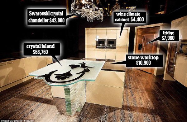 Prezzo esorbitante è dovuto ai materiali utilizzati per la loro. Cristalli e rame sono i principali “materie prime” utilizzate in quantità non modeste. Quindi, un controsoffitto della cucina,un lampadario di cristallo con migliaia di “pietre” Swarovski (e un prezzo di $ 42.000) elettrodomestici su ordinazione da parte della società tedesca Gaggenau, un frigorifero vale $ 7960 e un periodo di 8 mesi Chiamare definire la cucina più costosa al mondo.