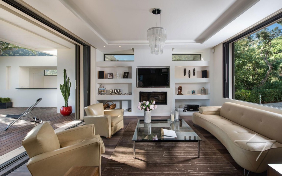 Circondati da un labirinto di verde, la casa presenta un interno pulito-allineato, arioso e molto luminoso. Il soggiorno si apre sulla terrazza all’aperto, ideale per entrambi, pranzo e relax.“Le grandi finestre panoramiche in tutta Villa Olive permettono alla luce del sole e la vista di inondare in, e con la sua struttura a pianta aperta ha una meravigliosa sensazione di spazio che attraversa il suo soggiorno, sala da pranzo e cucina gourmet. Al piano superiore, il comfort contemporaneo continua, con camere che beneficiano di ampie vedute di sole verso l’orizzonte.