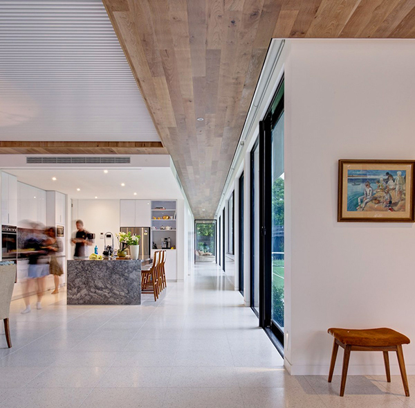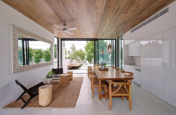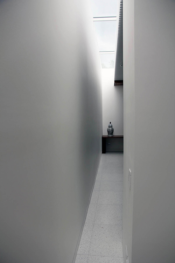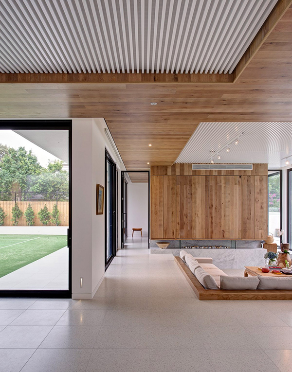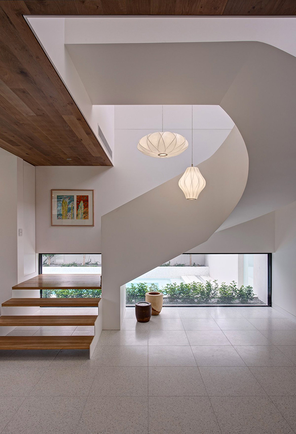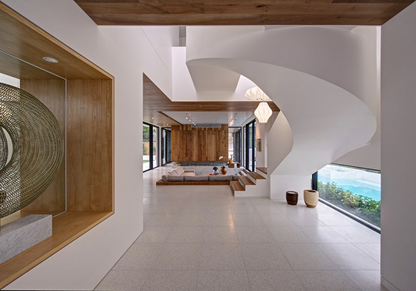 L’interno acquisisce la tranquillità dell’ambiente naturale, rendendo l’abitante voglia di degustazione la fuga dolce della libertà. Il cortile ha angoli cosparsi di ciottoli zen e un campo di erba verde smeraldo circonda la casa. “Lo spazio è stato curato dalla sua genesi, con lo stesso rispetto per il design come un museo. Scultura del soffitto, pareti e pavimento non solo crea partizioni scultoree in tutta la residenza, ma con lo spirito di una piscina di roccia, fornisce canali per fluire attraverso e delinea l’ampio spazio in cui abitare insieme.”Il risultato è una composizione armonica, che sembra evolversi insieme ai suoi abitanti.