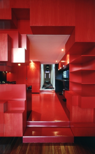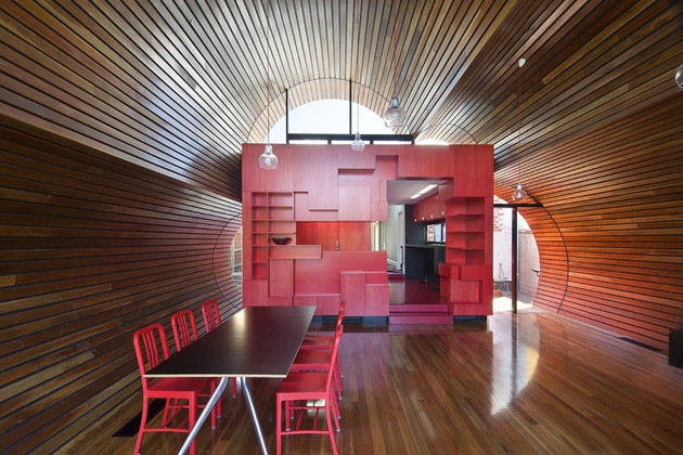 La costruzione non è un progetto da zero, ma è una dependance di una vecchia casa per quasi un secolo, progettato per portare un tocco di assemblaggio moderno e di trasformarlo in un punto di riferimento architettonico.La casa esistente ha un interno tradizionale,con camere spaziose, pavimenti in legno e finestre bianche. Il passaggio per la nuova ala dell’edificio è attraverso un corridoio di un rosso brillante composto da forme irregolari, che è la porta verso uno spazio ultra-moderno.